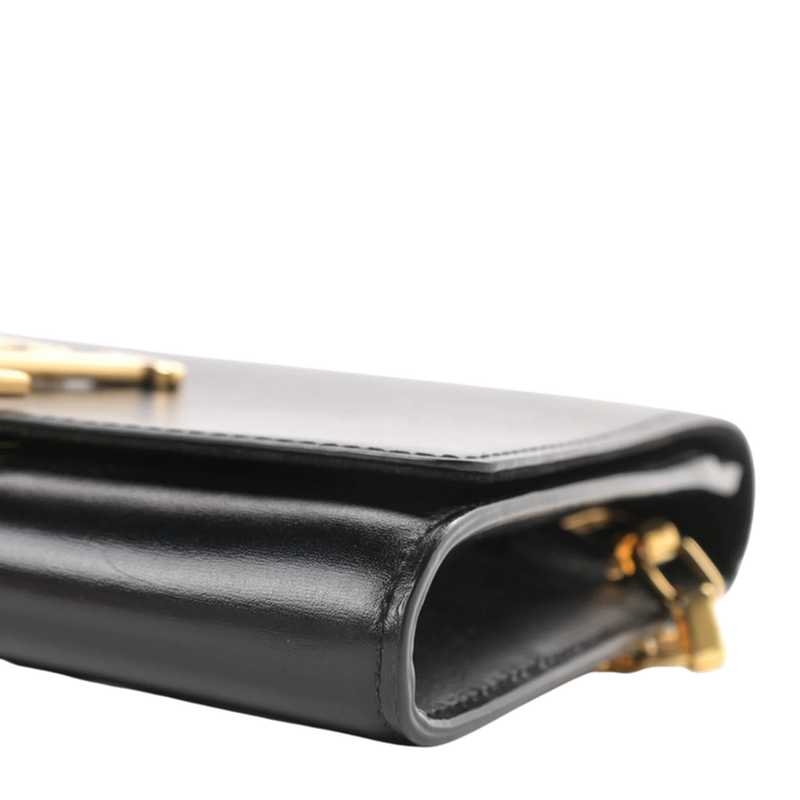 The flap opens into a soft Alcantara-lined interior featuring a slip compartment for organizing essentials. Though slim and refined, it comfortably fits a phone, wallet, keys, and small cosmetics, making it both practical and sophisticated. Ideal for evenings, events, and upscale outings, this pre-owned designer piece captures the essence of modern luxury with lasting appeal.
